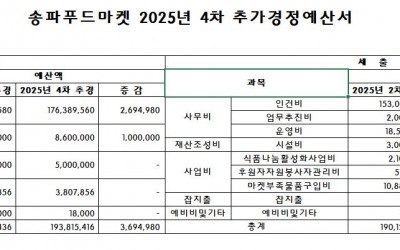 2025년 송파푸드마켓·푸드뱅크 4차 추가경정예산서를 사회복지법인 및 사회복지시설 재무회계규칙 제10조 4항에 의거하여 공고합니다. …